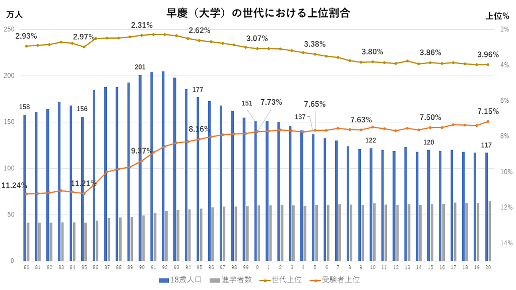 - 1980年時点ã§å—験者間ã®ä¸Šä½å‰²åˆ11%å°ã§ã‚りã€ãã“を底値ã¨ã—ã¦ã€å¾ã€…ã«ä¸ŠãŒã£ã¦ã„る(ï¼ä½Žå€¤åŒ–ï¼é›£åŒ–ã—ã¦ã„る)。1990å¹´å‰å¾Œã®ç§å¤§ãƒãƒ–ãƒ«ã§æ€¥å³»ãªä¸ŠãŒã‚Šã‚’見ã›ã€2000年以é™ã¯7.5%å‰å¾Œã§æ¨ªã°ã„~やや上ãŒã‚Šã¨ãªã£ã¦ã„る。ã¤ã¾ã‚Šã€å—験者間ã§ã®ç«¶äº‰çއã¯ã€ç¾åœ¨ãŒæœ€ã‚‚高ã„ã®ã§ã‚る。イメージã§ã¯æ˜”ã®æ–¹ãŒå—験競争ãŒç†¾çƒˆã§ã‚ã£ãŸã¨æ€ã‚れã¦ã„ã‚‹ãŒã€é€†ã®çµæžœãŒå‡ºã¦ã„る。ã“れã¯ã€æ˜”ã¯å®šå“¡ãŒã‚„ã‚„å°‘ãªã‹ã£ãŸã“ã¨ã‚’考ãˆã¦ã‚‚傾å‘自体ã¯å¤‰ã‚らãªã„ã§ã‚ã‚ã†ã€‚