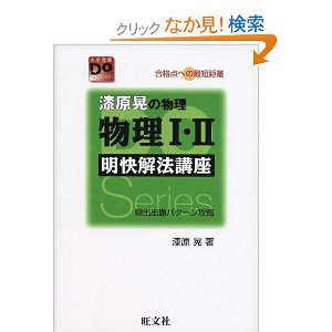 | □ 解説 講義形式で物理を教えてくれる独学者向けの物理の参考書である。明快解法講座と応用実践講座とでは対象レベルが異なり、「明快解法講座」は物理のエッセンスと似たような位置、「応用実践講座」は名門の森物理と似たような位置づけになっている。人気の方は断然「明快解法講座」の方が高い。これは、レベルが上がるに従って選択できる問題集が多くなるうえ、講義形式の問題集より問題演習をたくさん行う問題集を好む傾向にあるからである。初学者の場合はそれほど問題集がなく、合う合わないという性質が強いためである。 □ 明快解法講座 「明快解法講座」は分かりやすいのだが、橋本の物理をはじめからていねいに等で軽く勉強した向けのレベルとなっている。偏差値で言うと50〜55程度を取れる人がよい。どの問題も1度2度見たことある基本的な良問ばかりを取り扱っているため、公式の使い方が分からず暗記しているだけの人にも向いている。解説の詳しさが秀逸であるため、3周程度して理屈を暗記してもらいたい。物理のエッセンスよりも解説は詳しい。 □ 応用実践講座 「応用実践講座」は例題を漆原解法体系に沿って解説してある。また、各章には練習問題があり、これらは典型問題で構成されているため、全てを暗記しても損はない。また、冊子もかなり薄いためポイントを抑えるのに適しているが、問題演習量は不足するので、別の演習系の問題集で補う必要がある。この本はテクニックを学ぶ目的で使用したい。 □ その他情報 ・最も独学に向いている参考書。 ・本当にしっかりやりこめば、短期間で飛躍的に成績を伸ばすことができる。 ・漆原先生の独特のやり方なので、普通に学校で習うようなやり方の人や駿台系の微積を使うやり方に慣れた人はむしろ手を出さない方がよいのかも。 ・今まで色々な物理の参考書をやったがなかなか結果が出ない方にお勧め □ 漆原晃の物理のデータ