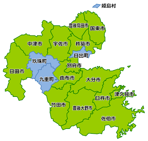 - 大分市別府市で県人口の半分に達する。これ以外には中核都市はなく、小規模自治体が散在する形態である。