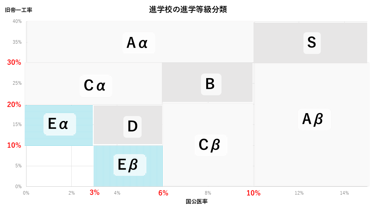 - E級高校は、国公医率3%~6%もしくは旧帝率10%~20%の高校を指す。