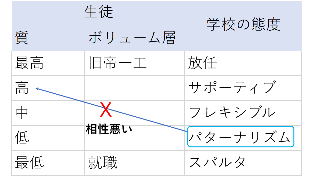 医å¦éƒ¨å—験ã®é«˜æ ¡ç·è«–ã§ã‚‚è¿°ã¹ãŸãŒã€ç”Ÿå¾’ã®è³ªã¨å¦æ ¡ã®æ…‹åº¦ã«ã¯å¯†æŽ¥ãªé–¢ä¿‚ãŒã‚る。生徒ã®è³ªãŒä½Žã‘れã°ã‚¹ãƒ‘ルタå¼ã€é«˜ã‘ã‚Œã°æ”¾ä»»ä¸»ç¾©ã®ç›¸æ€§ãŒè‰¯ã„。生徒ã®è³ªã¨å¦æ ¡ã®æ…‹åº¦ã‚’5段階ã«åˆ†ã‘ã‚‹ã¨ã™ã‚‹ã¨ã€ä»¥ä¸‹ã®ã‚ˆã†ãªå¯¾å¿œãŒæ¯”較的相性ãŒè‰¯ã„。