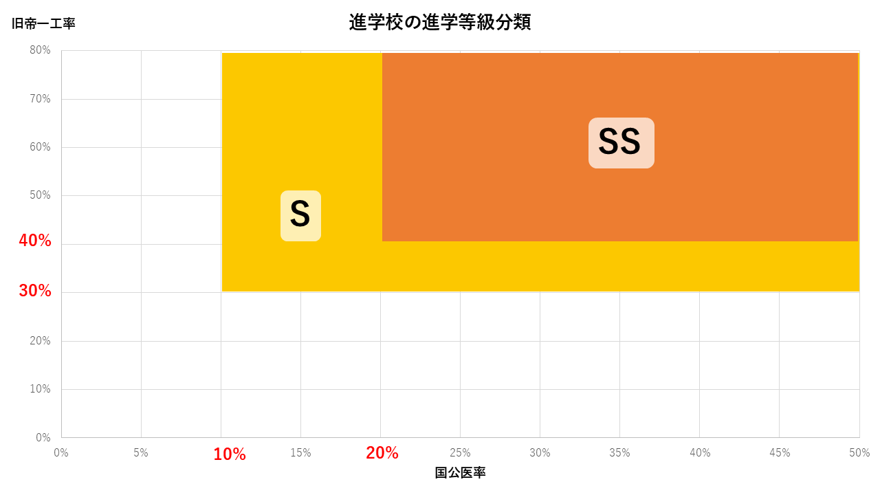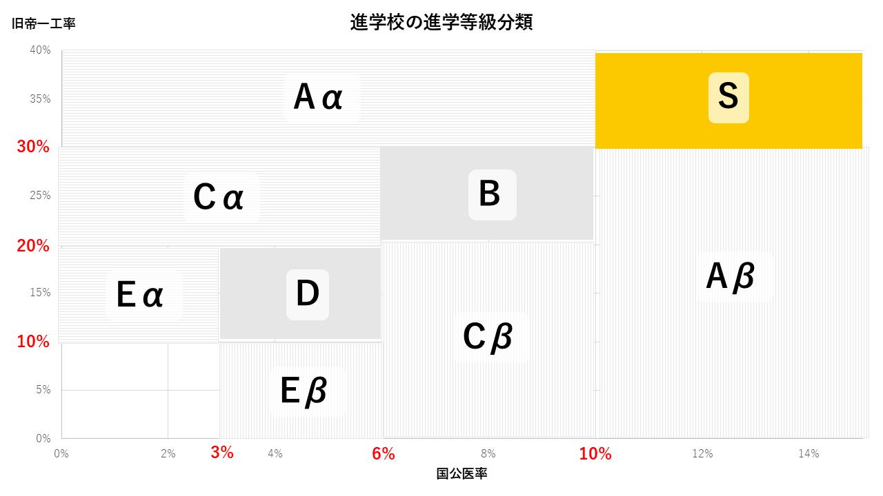 - S級高校は、国公医率10%以上かつ旧帝率30%以上の高校を指す。